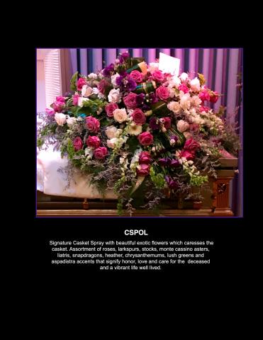 Beautiful exotic assortment of roses, larkspurs, stocks, liatris, snapdragon heather, chrysanthemums, lush greens and more accents for the deceased and a vibrant life well lived.