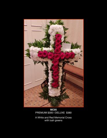 A White and Red Memorial Cross with lush greens.